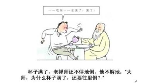 古時(shí)候一個(gè)佛學(xué)造詣很深的人,去某個(gè)寺廟拜訪一位德高望重的老禪師。老禪師的徒弟接待他時(shí),他態(tài)度傲慢,心想:你算老幾?后來(lái)老禪師十分恭敬地接待了他,并為他沏茶?稍诘顾畷r(shí),明明杯子已經(jīng)滿了,老禪師還不停地倒。來(lái)者甚是不解。大師說(shuō):“是啊,既然已滿了,干嘛還倒呢?”禪師的意思是,既然你已經(jīng)很有學(xué)問(wèn)了,干嘛還要到我這里求教?來(lái)者急忙叩謝悔過(guò)。據(jù)說(shuō),這就是“空杯心態(tài)”的起源。