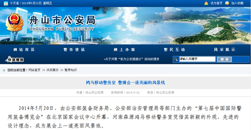 2014520日,由公安部裝備財(cái)務(wù)局、公安部治安管理局等部門主辦的第七屆中國國際警用裝備博覽會在北京國家會議中心開幕,河南森源鴻馬流動警務(wù)室憑借其新穎的外觀、先進(jìn)的設(shè)計(jì)理念,成為展會上一道亮麗風(fēng)景線。
