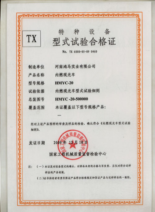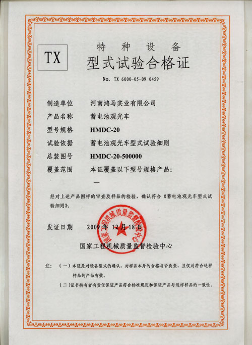 前段時間,公司就20座內燃觀光車和蓄電池觀光車向國家工程機械質量監(jiān)督檢驗中心提交了申請,經(jīng)過國家工程機械質量監(jiān)督檢驗中心的專家組委會的認真審查,對20座內燃觀光車和20座蓄電池觀光車的圖樣進行了審核,并對樣品進行了檢驗,確認符合《內燃觀光車型式試驗細則》,對鴻馬電動汽車的20座內燃觀光車和20座蓄電池觀光車頒發(fā)了特種設備型式試驗合格證。