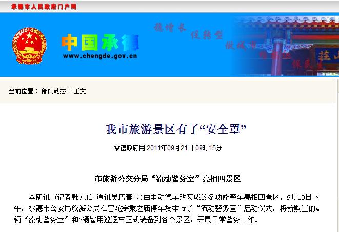 承德政府網(wǎng)報(bào)道:我市旅游景區(qū)有了“安全罩”鴻馬流動(dòng)警務(wù)室